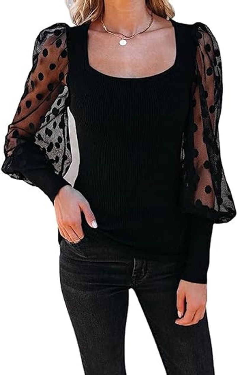 Our elegant and versatile women's top, perfect for various occasions including work, office, and casual outings. This top features a square neckline, long sleeves adorned with netted polka dot, Swiss dots, or dobby dots, and a ribbed knit body for a comfortable fit. The pull-on closures add convenience while the top remains unlined for a sheer and sophisticated look.