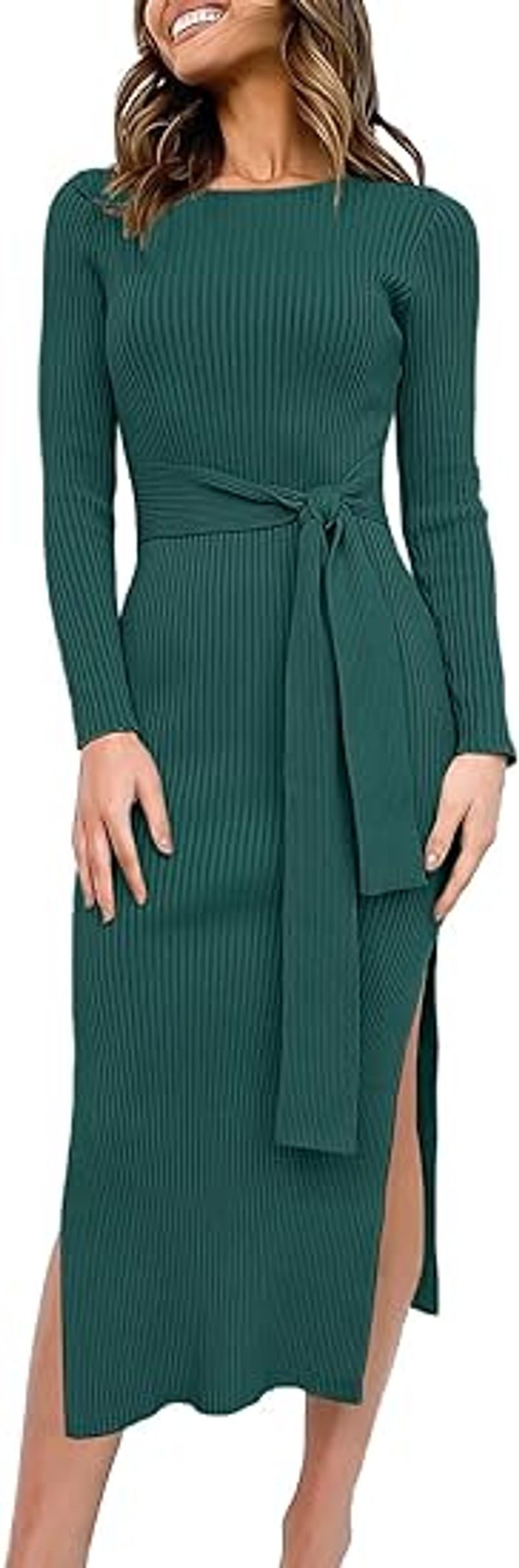 Feature: Midi length, Ribbed knit, Long sleeve, Crew neck, Waist belt, Side slit, Slim fit, Elegant and casual style.